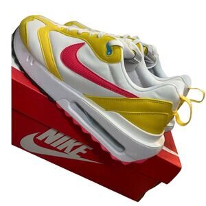 Step up your shoe game with these brand new Nike Air Max Dawn sneakers! These stylish and versatile shoes come in a vibrant yellow, white, and red colorway, perfect for adding a pop of color to any outfit.