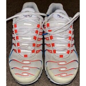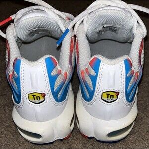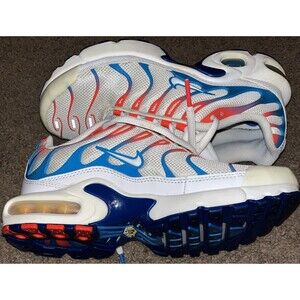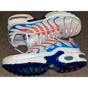 The NIKE AIR MAX PLUS GS Girls Running Shoes CQ9893 400 in Blue Hero and Crimson are designed for active young girls who love to run and stay active. These lace-up shoes feature a round toe, low heel, and standard shoe width, making them comfortable for various activities such as running, basketball, tennis, and more. The synthetic upper material and fabric lining ensure durability and breathability, while the blue hero and white color scheme with accents of bright crimson add a fun and stylish touch. Perfect for any season, these Nike Air Max Plus GS shoes are a great choice for young athletes and active kids looking for quality athletic footwear. Pre-owned and this shoe does not come in a box.
