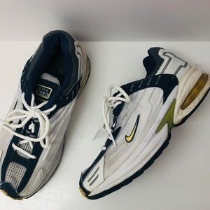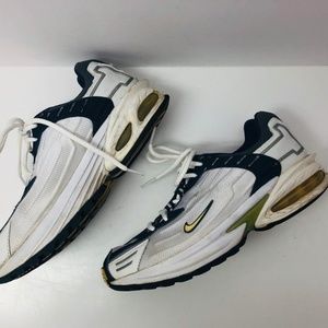 Super cute ladies Nike Air Max Triax 94 running shoes. White with navy blue accents and yellow Nike logo. Moderate wear and there is some damage to the back of the sole - see photos. Doesn't appear to affect the look or functionality and priced accordingly. Feel free to ask any questions or request additional photos prior to purchase. Thank you!