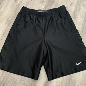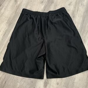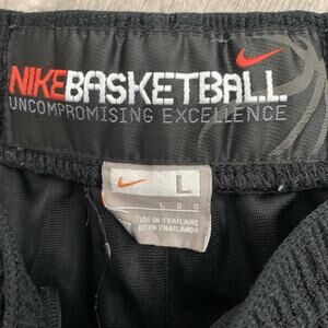 The product is a pair of men's large black Nike basketball shorts with a Y2K athletic style. Made from 100% polyester, these athletic sports shorts feature a solid pattern, pull-on closure, and are machine washable. The shorts are lined and have a 9.5-inch inseam, perfect for basketball or active wear. They are vintage, featuring the iconic Nike brand and a sporty theme. Perfect for men looking for comfortable and stylish athletic shorts.