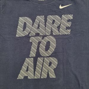 Sporty and bold, this blue Nike tee features the “Dare to Air” spellout and chest swoosh. Large size (21x25), athletic and street-ready style.