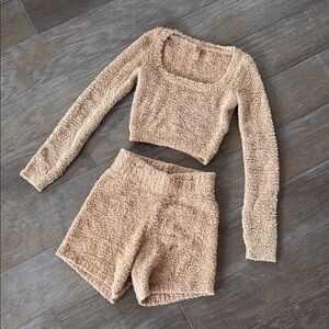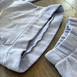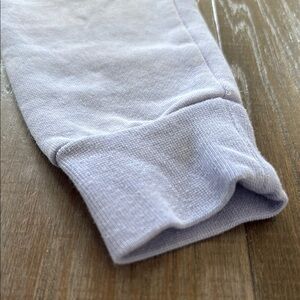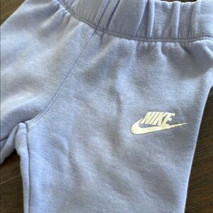 Matching fleece pants with elastic waist. Small ‘Nike’ logo and ‘Swoosh’ design trademark on one hip. Ribbed cuffs at ankles. Pull on style.
