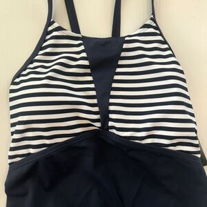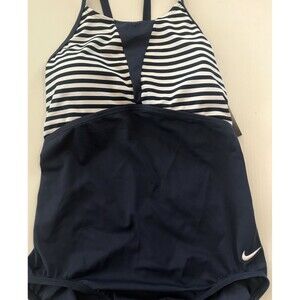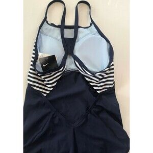Jump into the water with the Nike Women's Navy with white striped accent Chlorine Resistant One Piece.