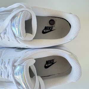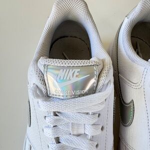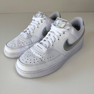 These Nike Court Vision Low Sneakers are in Very Good used condition. A modern take on 1980s basketball shoe. It's multi-color detailing is iridescent platinum silver.