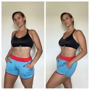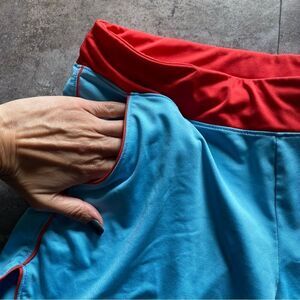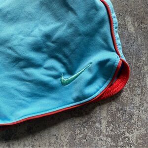 Retro shorts from Nike in powder blue and red/orange. The colors together pop. Elastic comfort waistband + side pockets. Please see photo section for approximate flat measurements + my model stats for fit reference as they fit smaller than a typical
