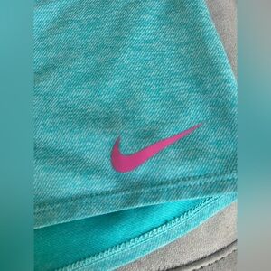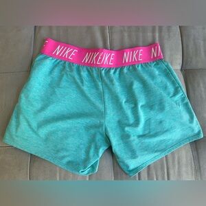 Nike Dri-Fit shorts. Turquoise with hot pink band and white lettering. Size says XL but I’m thinking it might be girls sizing bc they do not fit like an XL! I’m assuming XL in girls. I typically wear a L in women and these are way too small for me.