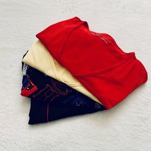 2 NIKE Dri-Fit Seamless Sport Tops (Red & Yellow) & 2 TAIL Tech performance skirts as interchangeable tennis pieces in great condition, no show of wear. Nike tops; bright colors that coordinate perfectly with TAIL tennis skirts. Both tops are size SM 100% Nylon, Dri-Fit, Seamless & V-Neck. Matching skirts are bright primary colors, polyester lycra-spandex size XS and 13"all around from waist to hem.