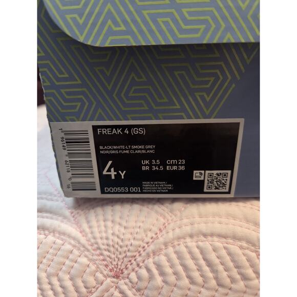 The NIKE "FREAK 4 (GS)" Size 4 YOUTH in BLACK/WHITE is a stylish and athletic sneaker designed for boys. This shoe belongs to the Gianni Nike Freak 4 product line, featuring the signature design of Giannis. With a UK shoe size of 3.5 and a EU shoe size of 36, this shoe is perfect for active young boys looking for a fashionable and functional footwear option. The black and white color scheme adds a versatile touch to the overall design, making it a great choice for everyday wear.