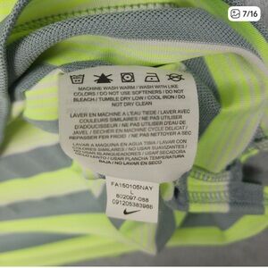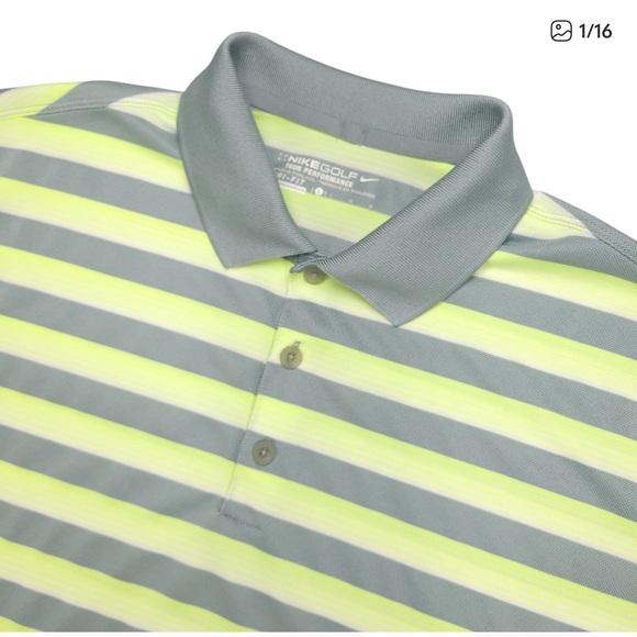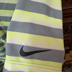 Stylish Nike polo with gray and yellow stripes. Ideal for casual and sporty wear.