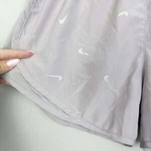 Cute gray running shorts by Nike. Elastic waist with drawstring. Lined with briefs. All over swoosh print. Lightweight. Great preowned condition with just a small mark as shown. Women’s size small.