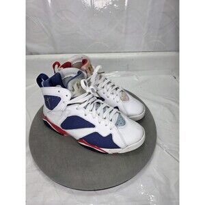 Pre-owned gently used Nike Air Jordan 7 Retro Tinker Alternate 304775-123 in size 9 (US) is a high-top sneaker featuring a white and blue color .