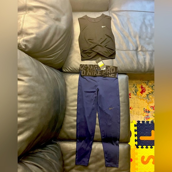 Selling this super cute set in a size Small. Leggings are 7/8 leggings in intertwist style (no longer sold online). They are in a navy blue color, New with tags. I’ve paired this legging with a small dry-fit, crop tank top in black. This one is new without tags. You’re getting a great deal for two items instead of just one. No wear, no tears, everything good with items. I just need Medium to feel more comfortable to weight lift. My loss is your gain! Please feel free to ask questions.