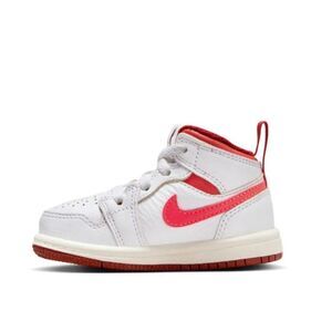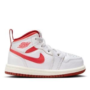 Adorable Nike Air Jordan 1 Mid SE sneakers (Toddler). White & Dune Red. Soft and flexible underfoot. Leather/synthetic upper. Lace up. Padded collar. Stitched swoosh logo. Air sole heel unit. Brand NIB!! Baby size 3C.