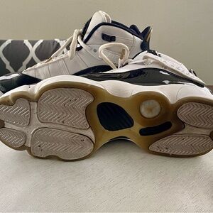 Stylish Jordan sneakers. Black patent leather accents. White mesh upper. Gold logo details.