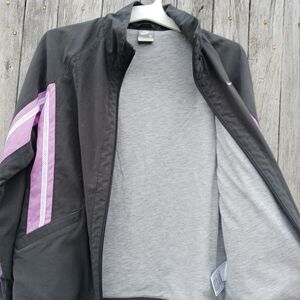 It's a gray color of full zip athletic jacket. It has purple stripes on the sides going down the sleeves. It also has pockets on the front.