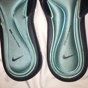 Perfect for athletes or just around the house! These teal and navy slides with Nike Comfort Footbed make you feel like your walking on clouds! Complete with velcro straps across top of foot and cute Nike detailing. Gently used, well taken care of. Stylish and comfortable!