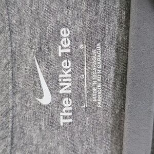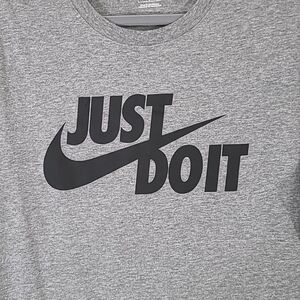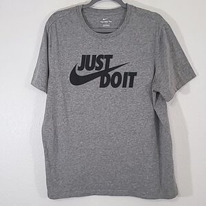 NIKE Men's The Nike Tee Gray/Black Just Do It Logo, size Large. Faint discoloration on logo (see pic) not noticed when worn. Gently pre-owned.