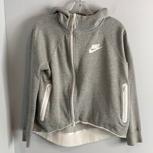 Style 930757-063 Nike high / low tech fleece jacket with zip hand pockets. Hooded. No flaws. Smoke Free. One day shipping. Stock photo for fit purposes only. You will receive the one shown in the other pics.