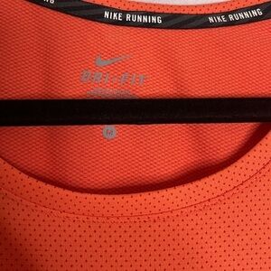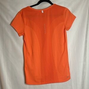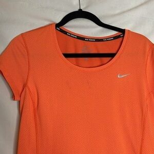 STYLE: Bright orange Nike scoop neck workout tee, mesh looking detail, breathable Dri fit material