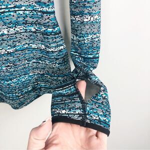 Nice stripe static print pullover shirt by Nike Pro. Dri fit technology. Long sleeves. Thumbholes. Half zip. Perfect for a run or walk. Shades of blue and turquoise with white swoosh. Great condition! Womens size small.