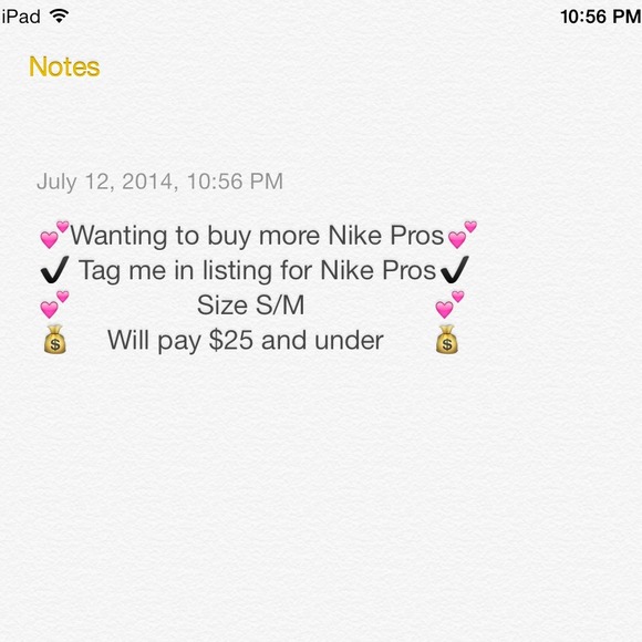 I have a pair of size small black nike pros, they're used alot the nike symbol is almost entirely gone. They are the old kind so they don't give you camel toe :) will sell for 15