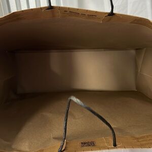3 Brown paper bags with black logo and design, black rolled paper handles.