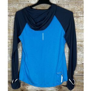 NIKE RUNNING SHIRT WITH CONTRASTING BLUE COLORS. HOODED. THUNB HOLES WITH FOLD OVER CUFFS. BACK OF SHIRT OFFERS SMALL ZIPPER POCKET. SMALL REFLECTIVE ELEMENTS ON BACK, FRONT, AND ARMS. NO FLAWS. SEE PICS FOR MATERIAL TAG. FEEL FREE TO SEND OFFERS.