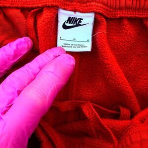 NIKE Red Fleece Swoosh Logo Sweatpants Joggers Athletic Pants Tapered Elastic Ankle Side Pockets Button Back Pocket Large