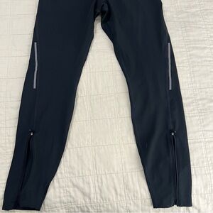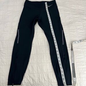 Nike logo on front, elastic waist, zipper pocket on back, zippered leg, reflective strip on the lower leg.