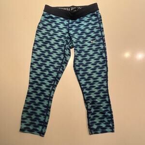NIKE Running Tights Womens XS Blue Aqua Fold Over Relay Print Dri-Fit Capri