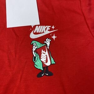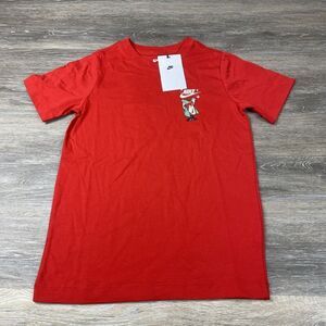 This Nike SportsWear T-shirt is perfect for boys who love the color red and the FUTURA dragon theme. The shirt is made with solid patterns and features short sleeves, a crew neckline, and embroidered accents. It is a regular fit and comes in size Small, suitable for older kids. The shirt is not vintage and is a basic style with the Nike brand logo.