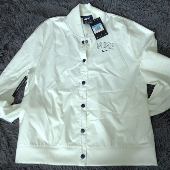 Nike Women's Jacket Sail Midnight NSW Retro Varsity Style Windbreaker size M. white with a midnight blue Nike logo