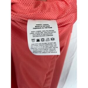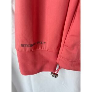 Nike STORM-FIT coral colored light-weight jacket. Jacket is pull-over with a zipper on the left shoulder. Adjustable cord at the hips to achieve desired fit. Light stripe patter on jacket. Please see photos for measurements and material.