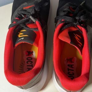 These are in almost new condition with no concerns to point out.   A great shoe!  They are black with a red/pink lining and toe.