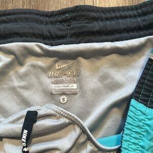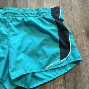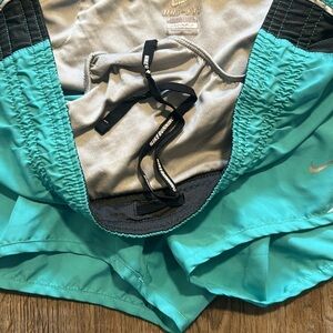 STYLE: Nike teal running shorts, black and white stripe detailing, liner on inside, elastic waistband and tie, look more teal in real life than they do in the photo lighting