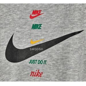 Keep your little one cozy and stylish with this Nike Toddler Boys Style Essentials Swoosh Just Do It Gray Hoodie. Featuring a large black Nike Swoosh logo on the front, along with multiple smaller Nike logos in various colors and the text "JUST DO IT." in green, this hoodie is perfect for any casual outing. Made from high-quality materials, it ensures comfort and durability. The hoodie has a front pocket, ribbed cuffs, and a ribbed hem for added warmth.