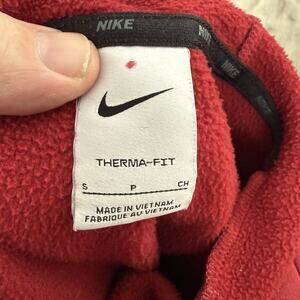 The NIKE Therma-Fit Hoodie for Men in size Small is a stylish and functional pullover designed for training and outdoor activities. Made from 100% polyester fleece, this hoodie features a logo graphic on the front, kangaroo pockets, and a standard fit for a comfortable and warm experience. The red color adds a touch of vibrancy to your activewear collection, making it perfect for winter and fall seasons. With its sweat-wicking fabric and soft feel, this hoodie is a must-have for any athletic man looking for quality clothing.