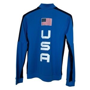Keywords: Nike jacket, varsity jacket, unisex fashion, blue jacket, Dri-FIT, slim fit, casual wear, full-length zip, USA team, sporty style, pre-owned, unisex outerwear, polyester jacket, all seasons, unisex casual jacket.