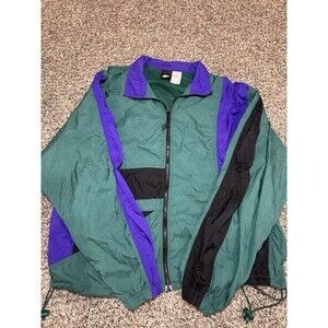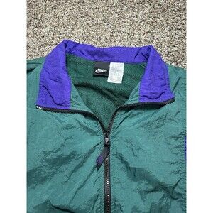The NIKE Vintage Men's Black Label Full Zip Windbreaker Jacket in Medium features a 100% Nylon outer shell with a colorblock pattern in green. This retro piece from Nike is designed for activewear, with a long sleeve and full zip closure for easy on and off. Perfect for cross training, basketball, or jogging, this windbreaker jacket combines style and functionality for the modern man looking to make a statement with their wardrobe.