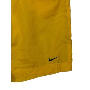 The product is a vintage pair of Nike men's sport shorts in size XXL. These yellow shorts are made of nylon with a mesh lining, featuring a drawstring closure and a flat front design. The shorts have a regular fit and a 7-inch inseam, perfect for casual occasions with a sporty theme. The classic Nike logo adds a stylish accent to this retro piece of athletic wear.