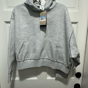 This Nike women's hoodie boasts the latest tech pack technology for superior warmth and comfort during any workout. The relaxed and oversized fit provides a comfortable and stylish look for any woman on the go. The cropped design and gray color add a trendy touch to this polyester hoodie, perfect for any casual occasion. With its unique features and high quality material, this Nike hoodie is a must-have for any fashion-forward woman.