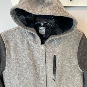 In excellent condition this Nike Destroyer Jacket is wool with ribbed hems at waist and arm openings. Varsity jacket style with hood! In excellent condition with no rips stains or holes! (JB)