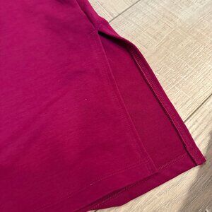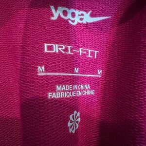 The product is a Nike Yoga Women's Cropped Hooded Dri-Fit Sweatshirt in magenta pink color, size medium. This pullover hoodie features long sleeves, a hood, and is designed specifically for activewear occasions such as yoga. The solid pink pattern and Nike branding add a stylish touch to this comfortable and functional piece of clothing for women who enjoy combining fashion and fitness.