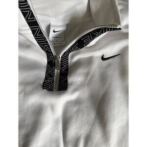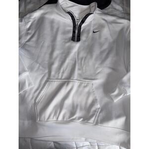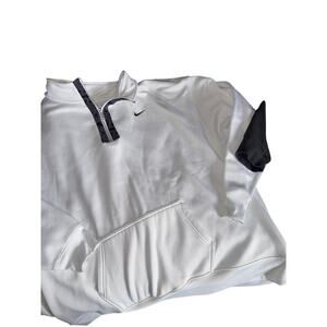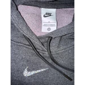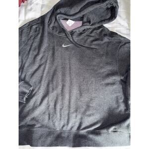 GRAY hoodie has Small speckled swoosh - small tear at seam on underside of right arm. Easy fix if you sew