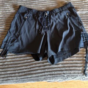 ZIP front and drawstring ties, 3 pockets adjustable on sides by ties. Size Medium. Navy Blue excellent used condition