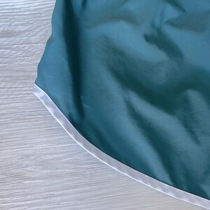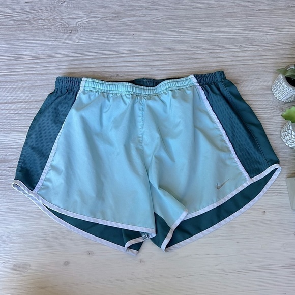 Nike Dri-fit running shorts. Light blue and teal. Silver, screen printed Nike symbol at lower left. Elastic waistband. Drawstring closure. Teal side mesh panels. Internal audio pocket or for small items at the back right. Light blue, internal brief gusset liner. Curved hem. Womens size small. Excellent preowned condition.