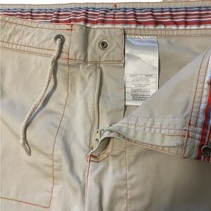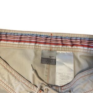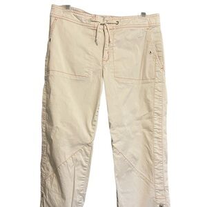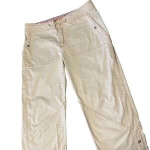 Nike Khaki Capris Women Size Small 4-6. They have subtle orange stitching. They are above ankle length or can be brought up higher with a snap. Has a drawstring with zipper and button. Super cute! There’s a very small stain. (Pictured)