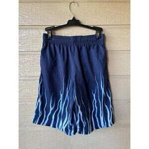 New without Tags and Never Worn, NIKE men's Navy Blue with Flame Accent Drawstring Elastic Waist Swim Shorts Trunks, size Medium x 9.5 inch inseam, mesh inner short lining with small covered inner pocket, slash pockets at hips.