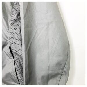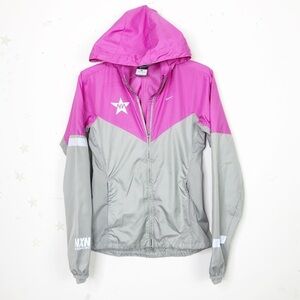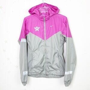 Nike pink and gray hooded running jacket, made from 100% recycled polyester with zipper pockets and drawstring waist and removable hood good condition gently preowned