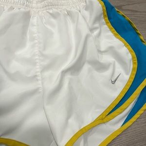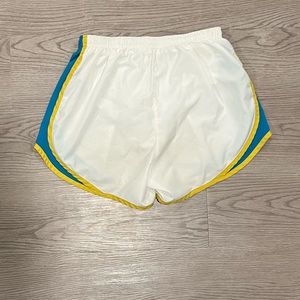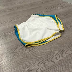 NIKE - women’s white athletic shorts w/ blue & yellow, size S, great condition